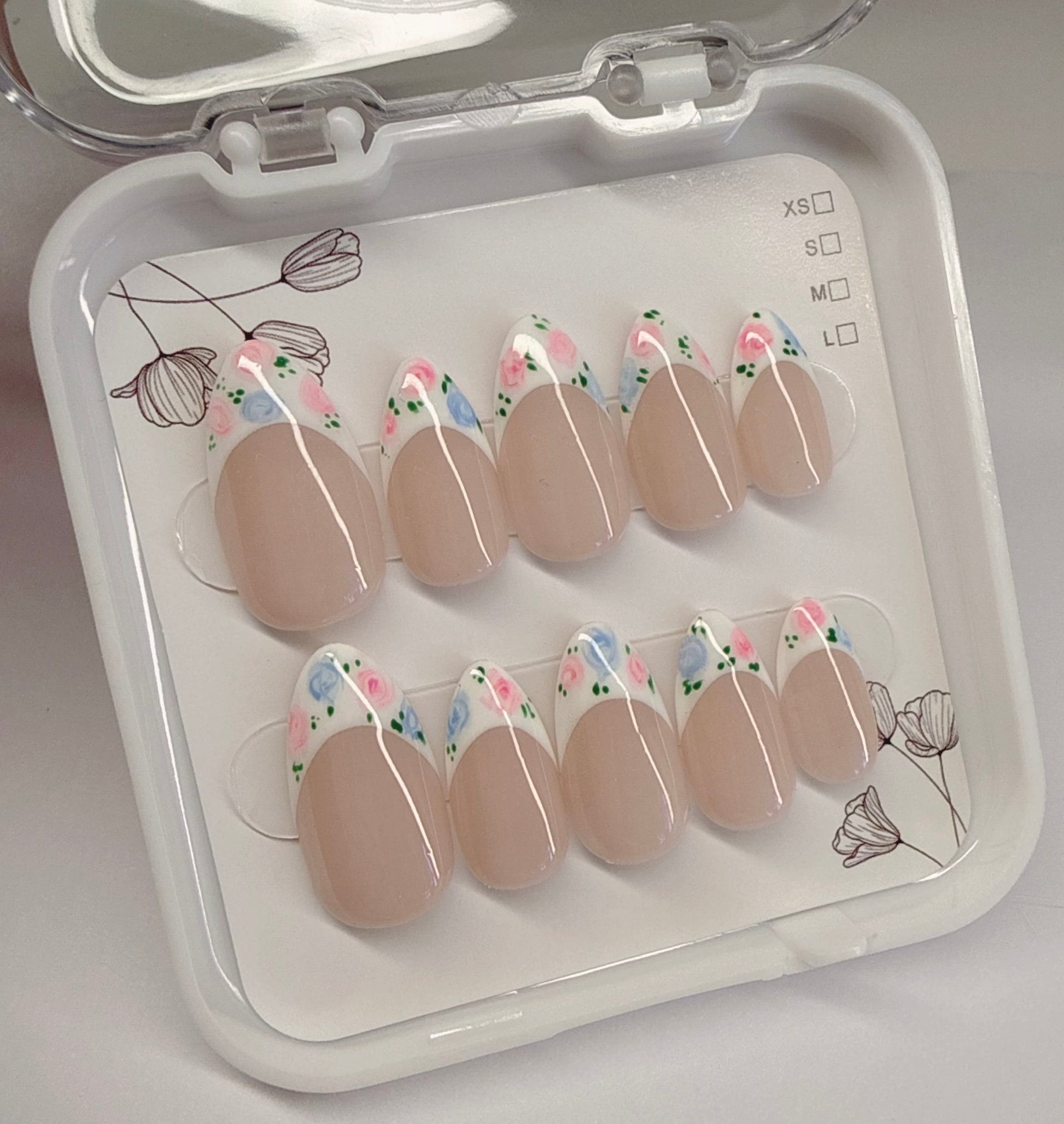 Step into spring with GARDEN BLOOM, a soft nude base paired with delicate hand-painted style florals. This set features a modern French tip twist, decorated with pink and blue blossoms and fresh green accents for a romantic, garden-inspired look.