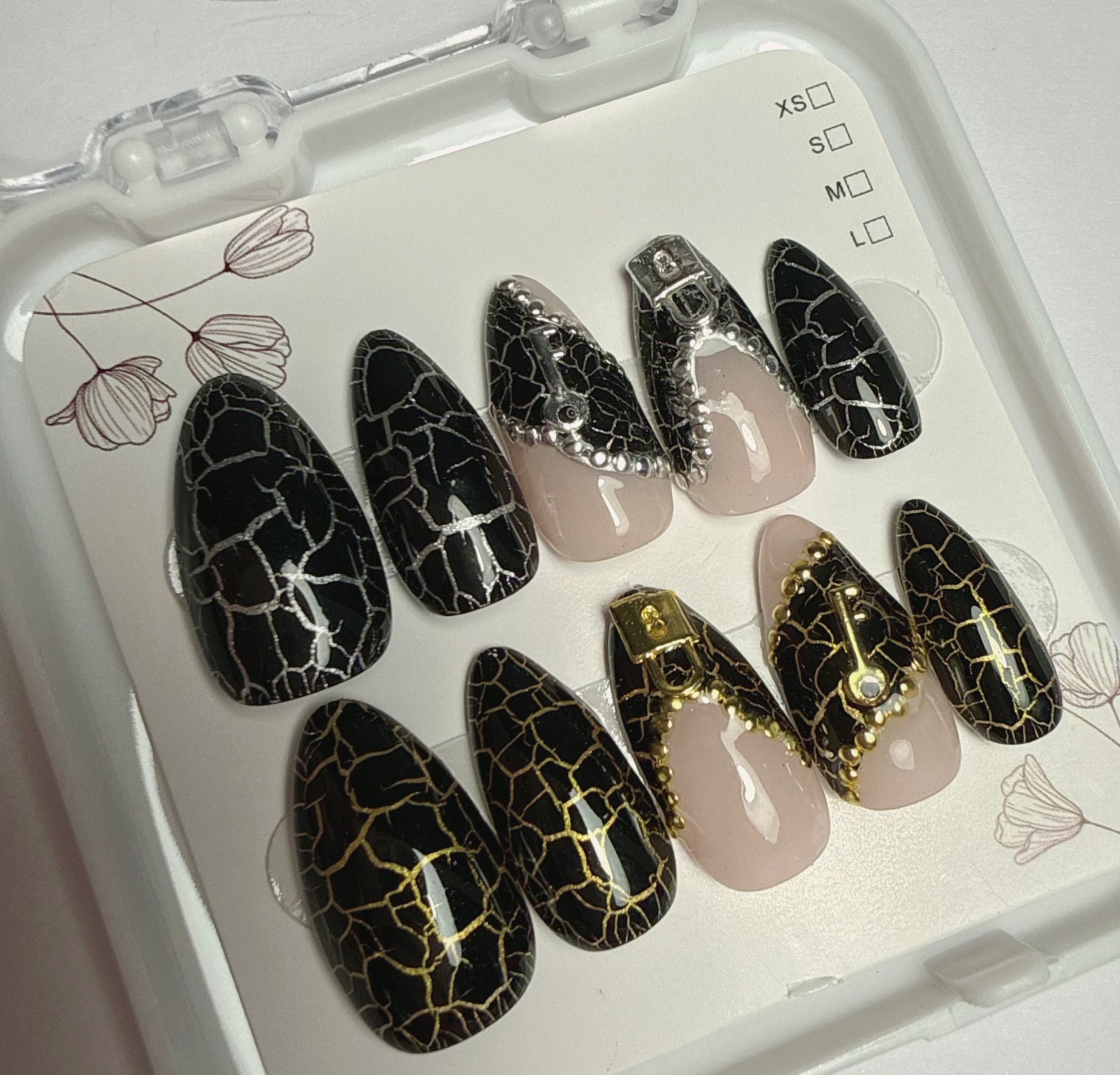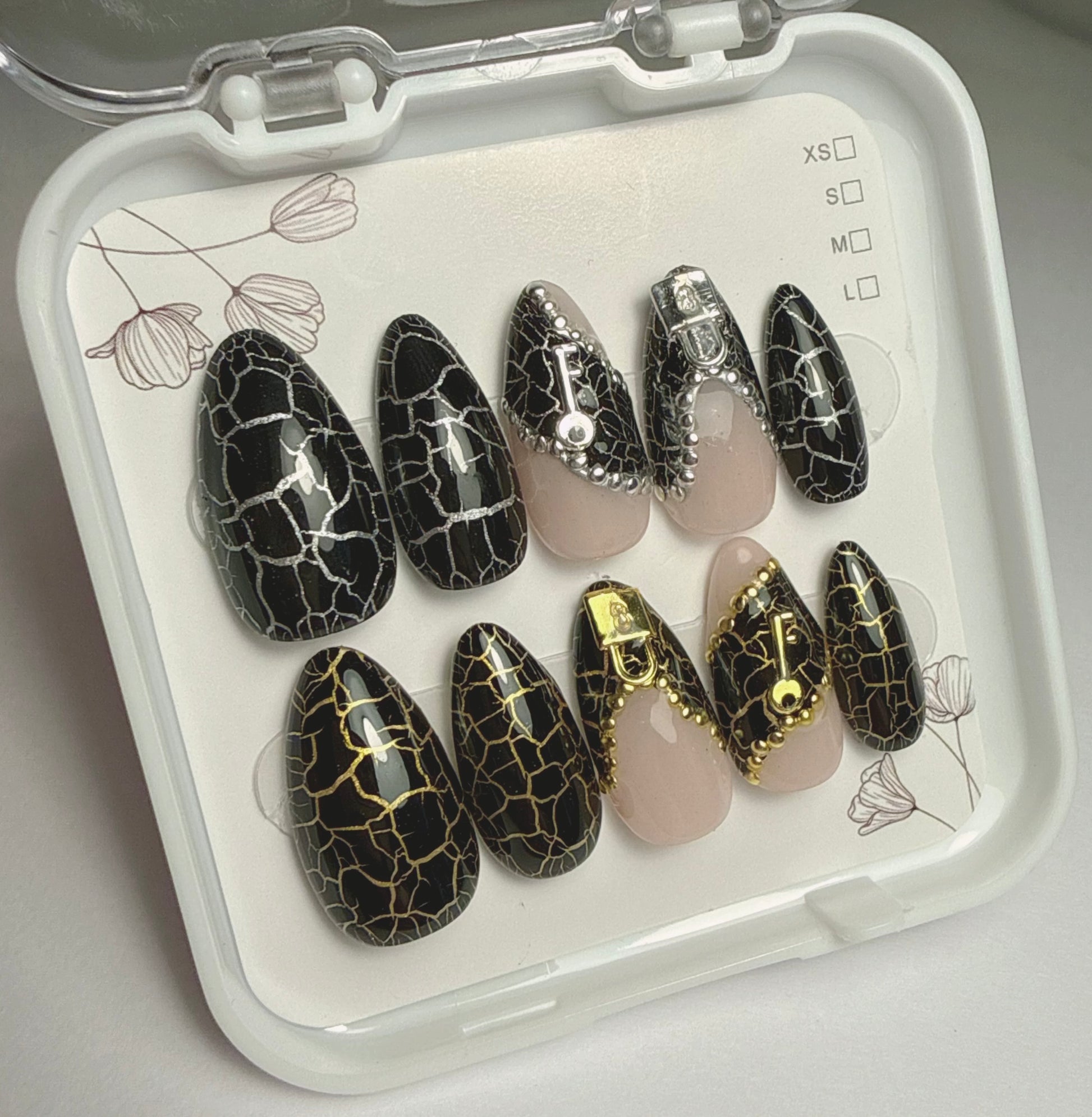 Bold black press-ons with gold or silver crackle detail, finished with 3D lock and key accents. A statement set that combines elegance with an edgy luxe vibe.
