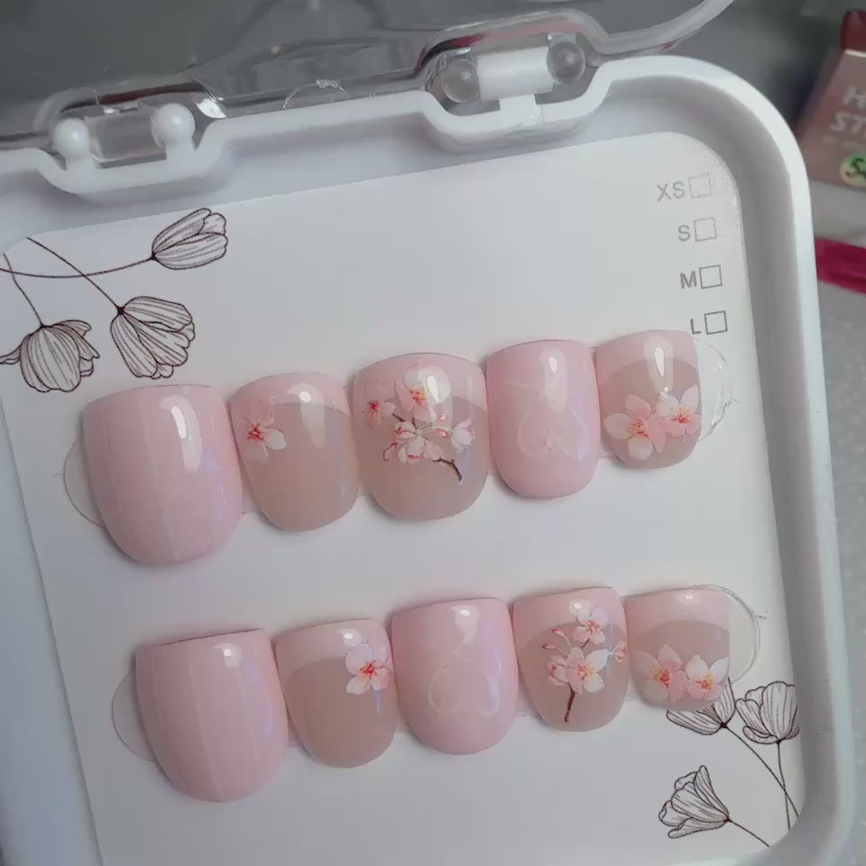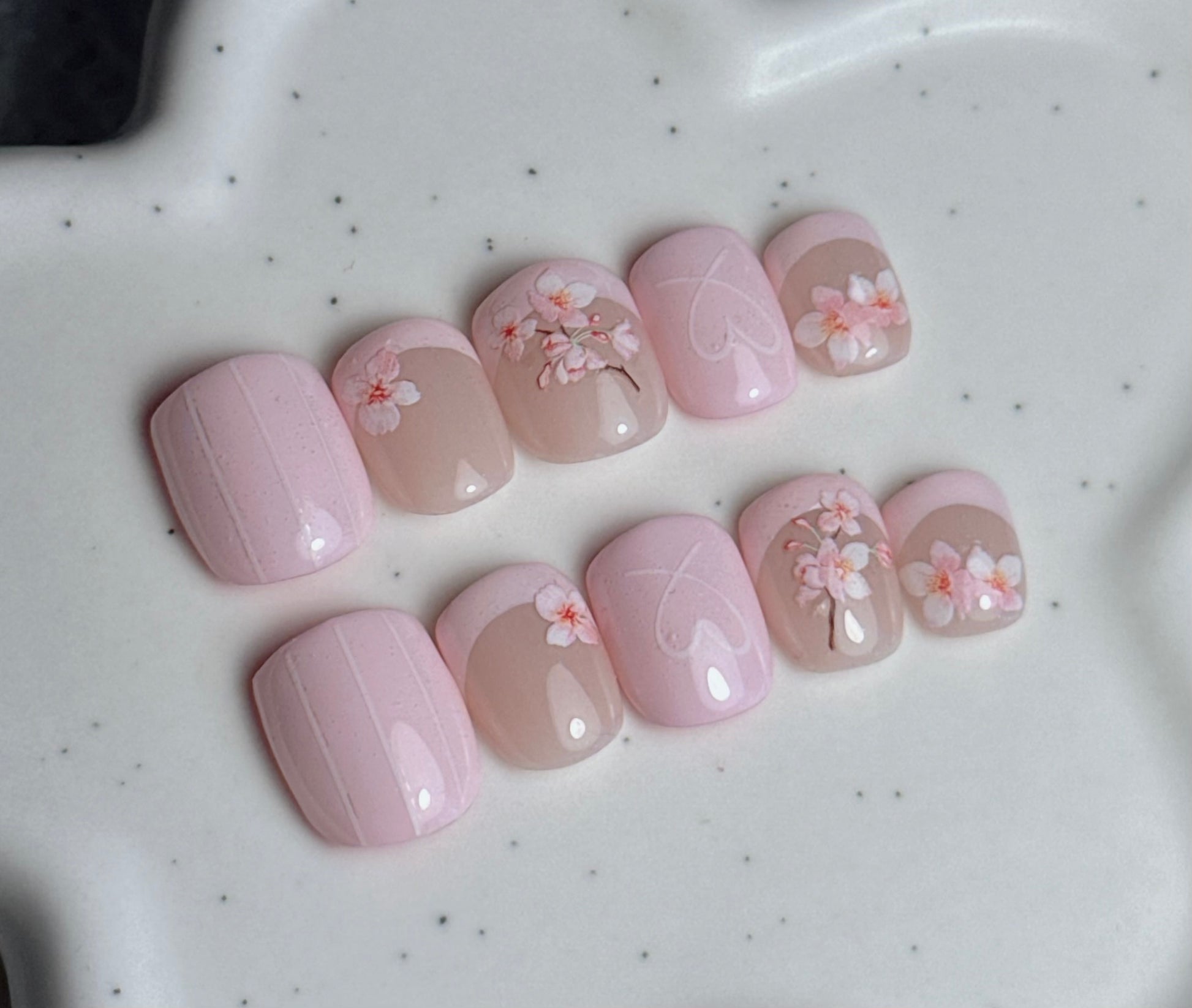 SAKURA KISS brings together soft blush hues and charming cherry blossom art for a look that’s sweet and flirty. With playful pink stripes, delicate flowers, and tiny heart details, these nails add a fun, romantic vibe that’s perfect for any day you want to feel extra cute.