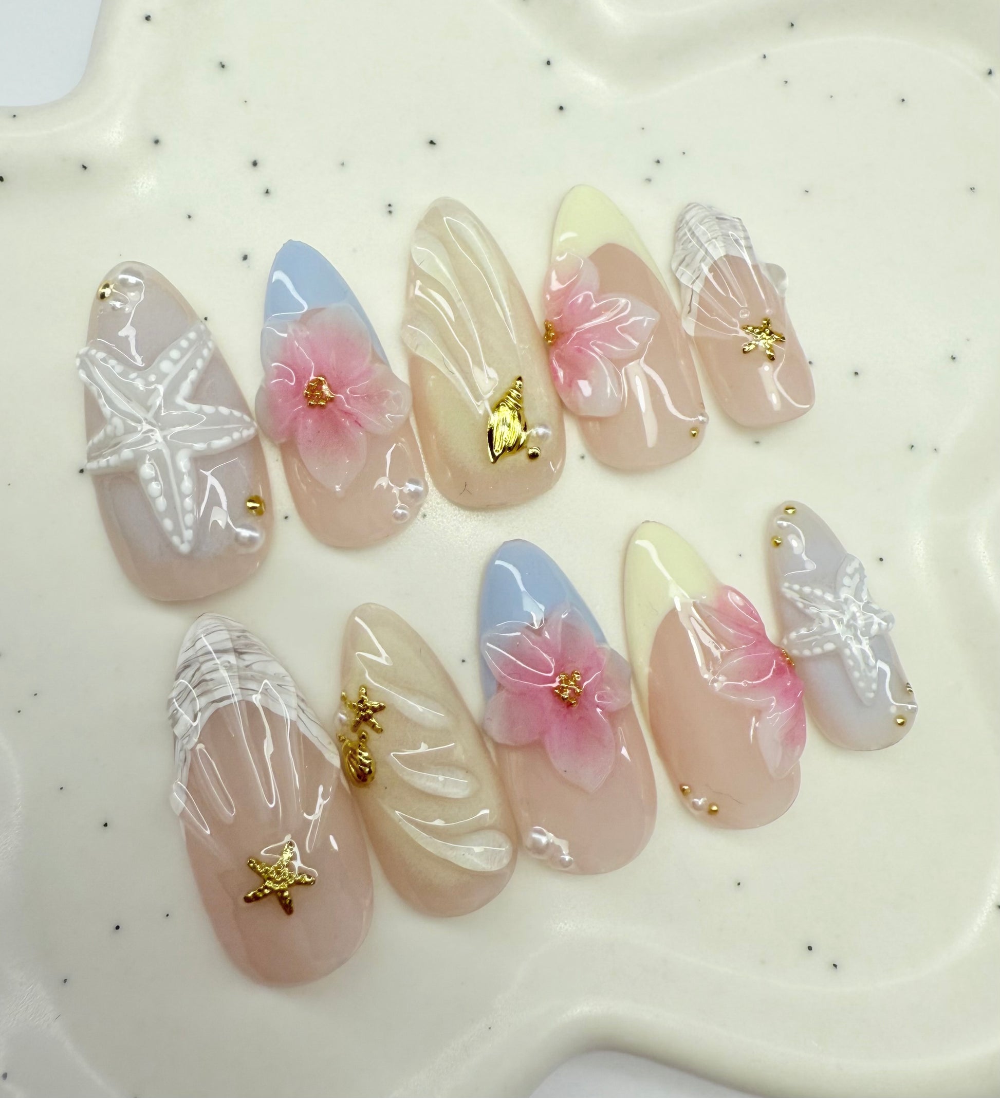 Bring the beach to your fingertips with our Seaside Bloom press-on nail set. Featuring soft pastel tips, delicate 3D pink hibiscus flowers, shimmering gold accents, and intricate starfish and seashell details, this set captures the beauty of a tropical shoreline. Perfect for summer holidays, beach weddings, or when you just want to carry those sunny, ocean vibes with you wherever you go.